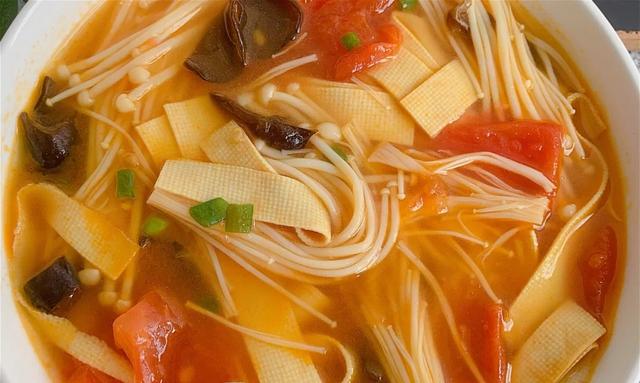 - 番茄切块、金针菇洗净、木耳切丝、豆皮切丝